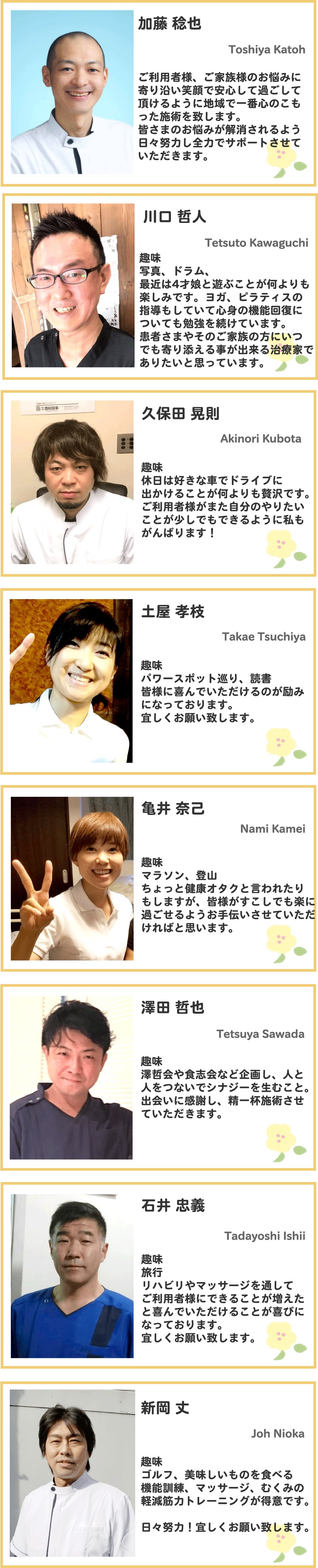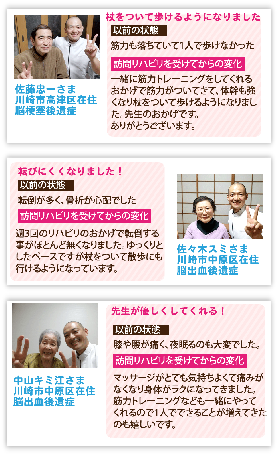 全員が川崎市近郊に在住の信頼できるスタッフです。リハビリの実力も人柄も信頼できるスタッフのみがお客様のご自宅に伺いますので、安心と評判です。