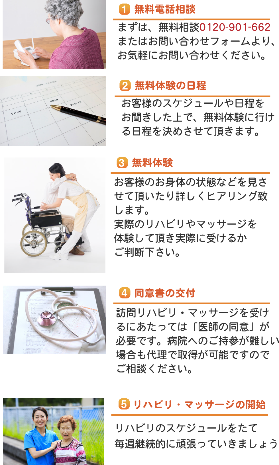 ご自宅まで訪問してリハビリやマッサージを30分程度行わせて頂きます。