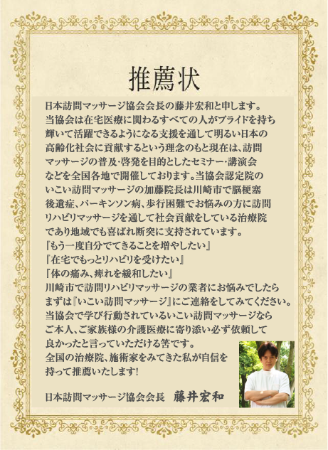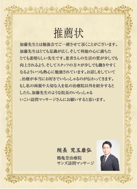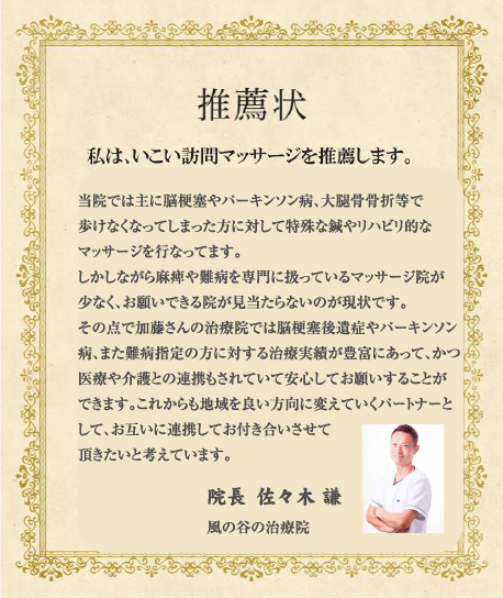 あなた様に喜んでいただけるリハビリやマッサージを行う自信がござい